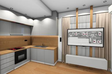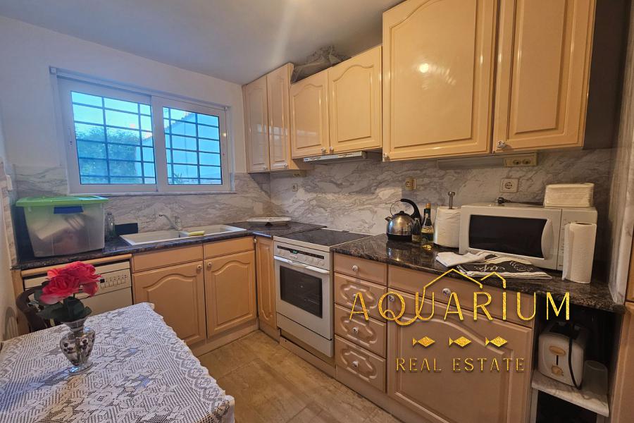 Kitchen with built-in appliances, renovated bathroom and bedroom with electric shutters.